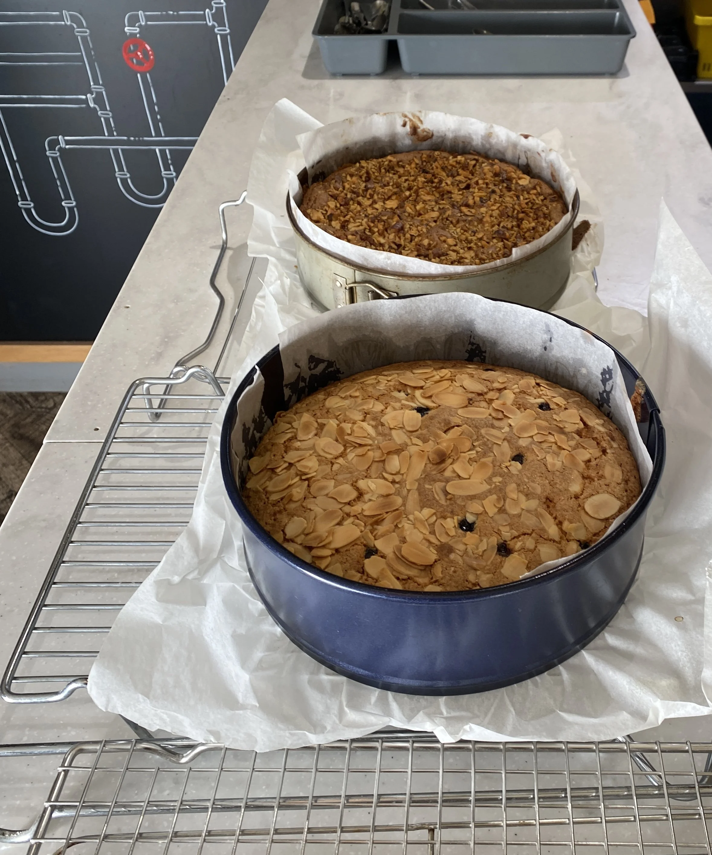 Two baked desserts in round pans on a wire rack. The front dessert has sliced almonds on top. The back dessert has a chopped nut topping. Both are on a sheet of parchment paper on a light-colored countertop.